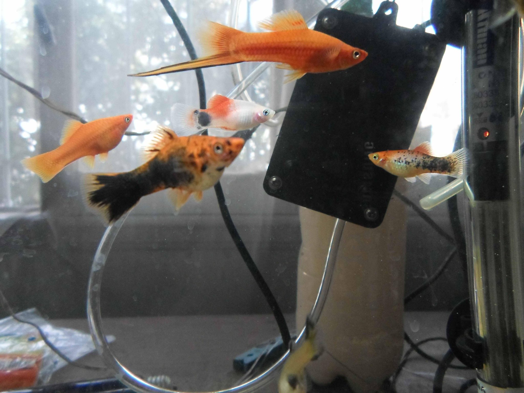 Yendo al punto, tengo una pregunta: el pez moteado hembra rojo y negro que se aprecia de mas cerca, algo fuera de foco. Por su movilidad permanente y la forma incesante en que nada, mas "algo" que percibo en su forma y textura de escamas me parece que es un híbrido entre Molly y Platy, puede ser?